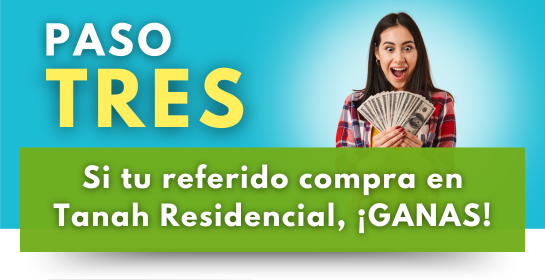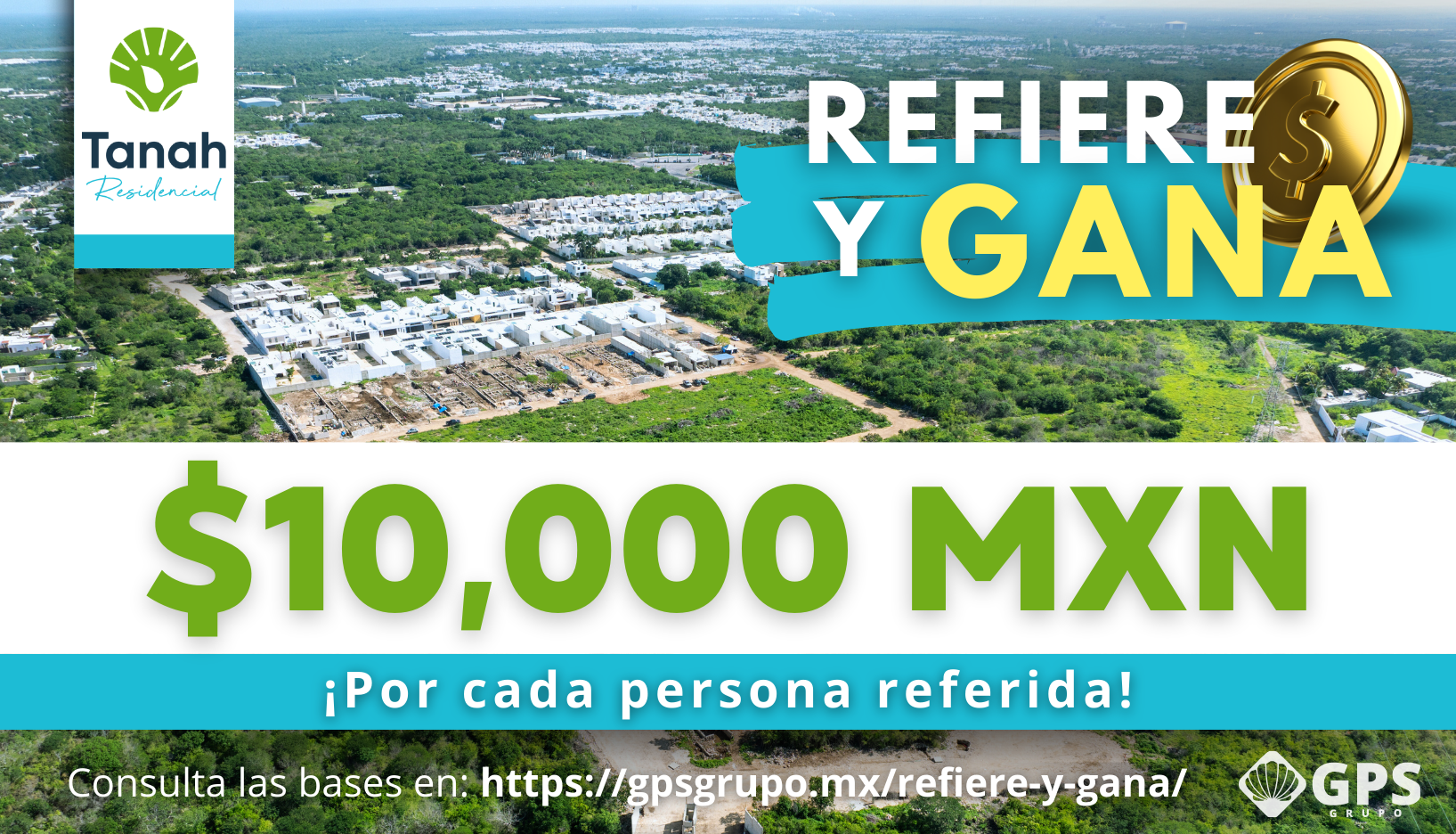 «Te bonificamos $10,000 MXN por cada referido que adquiera un lote en nuestro desarrollo Tanah Residencial». Consiste en la entrega de una bonificación al «Referente» por el monto total de $10,000 MXN, aplica para todos los lotes, de cualquier ubicación y/o superficie, dentro del proyecto Tanah Residencial.